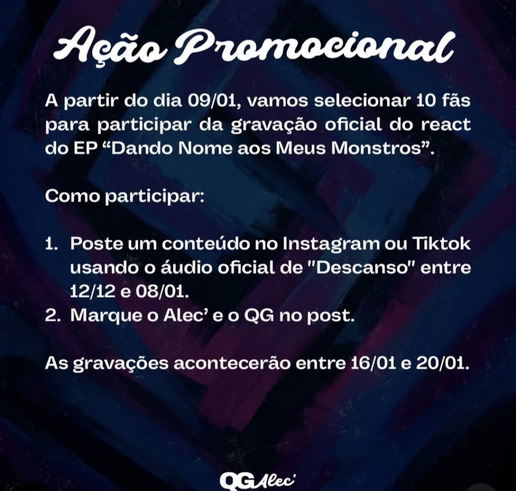 “QG Alec”, perfil da equipe do cantor, anuncia campanha interativa com gravações presenciais e online até 8 de janeiro